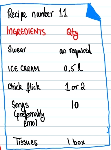 This happened about 3 months ago and a few days back I finally mustered up the courage to ask her if she is feeling alright now and the response I got was, “I am ok”. So i told myself see that wasn’t so bad and  maybe I can ask her if she has forgiven me because it has been 3 months. Sadly the response I got was, “I know and i don’t care!”. Another OUCH moment! I am a very emotional person and obviously I felt bad and heart broken. Hence i took out my recipe book and looked up the recipe to deal with a heart break and here I am sharing it with you now. Hope this helps 😉